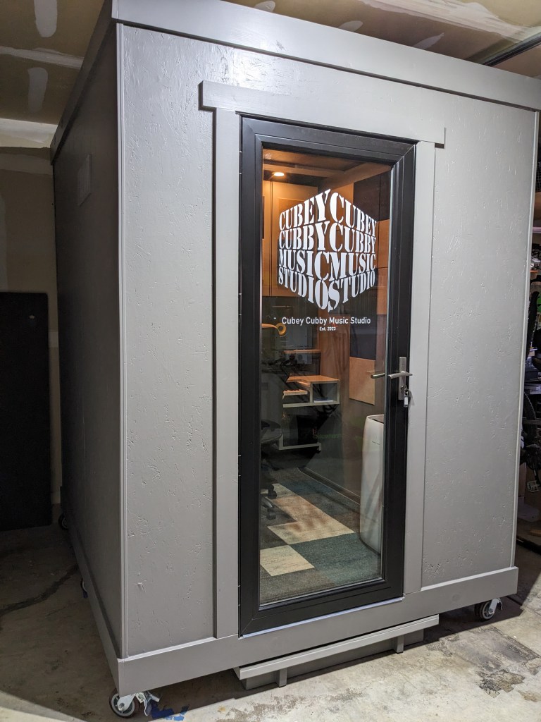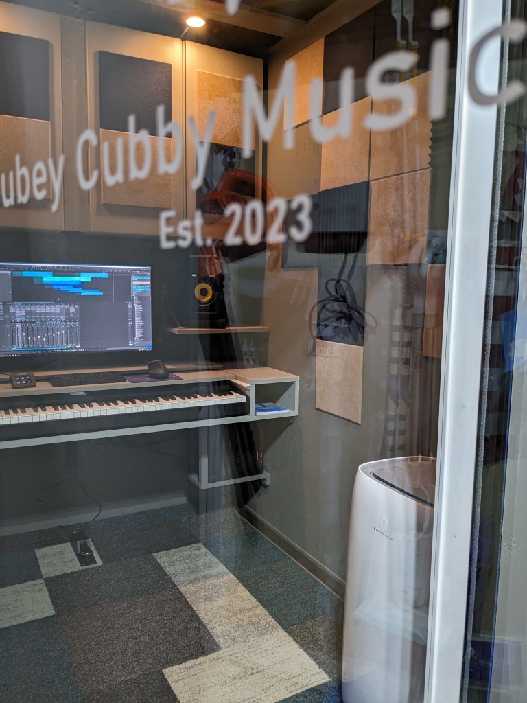 So sometime during Spring ’23, I was just not feeling good in the under stairs closet studio anymore. It had served its purpose to get me isolated from the rest of the house in order to compose, but I was just feeling too cramped and it was impacting my ability to work in there. My wife and I explored the option of expanding the house, which was basically walling in the back patio, but we were quoted $100,000 or more to do so. That is when I came up with the idea of creating my own custom space in the garage. Width-wise, it is about the same as the closet, but now I have much more depth, meaning I could actually push my chair back from the desk. I named it the Cubey Cubby Music Studio and you can see some pics below.