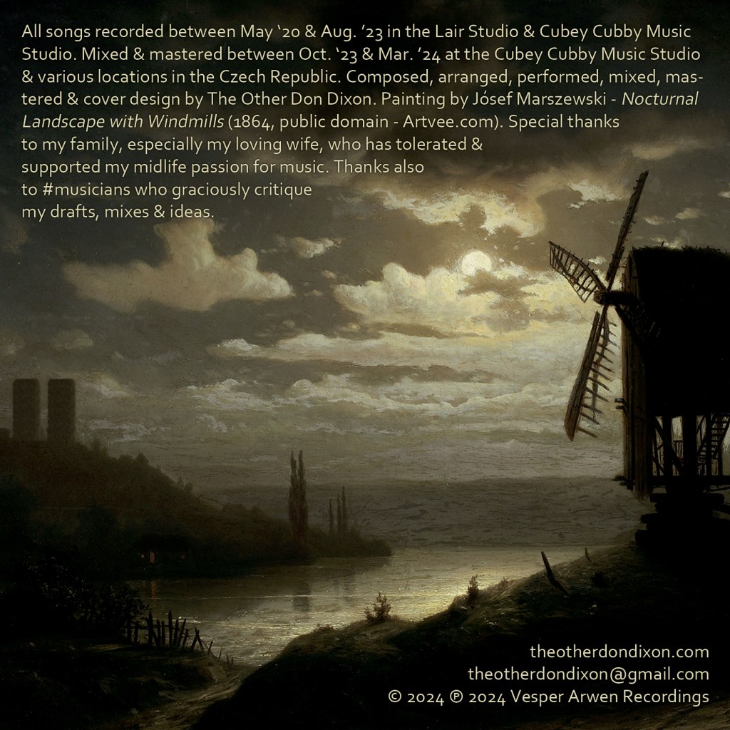 Nocturnal Landscape with Windmills (1864) by Jósef Marszewski So let’s delve into what I really thought I could use from this painting. First of all, we have two windmills that are in a paused state and 2 is a very important number for this album because it is the 2nd album by The Other Don Dixon. You can see the same thing just to the right of the windmills with 2 people in a paused state looking out in the distance. So taking these elements from the painting, I came up with this for the front cover: