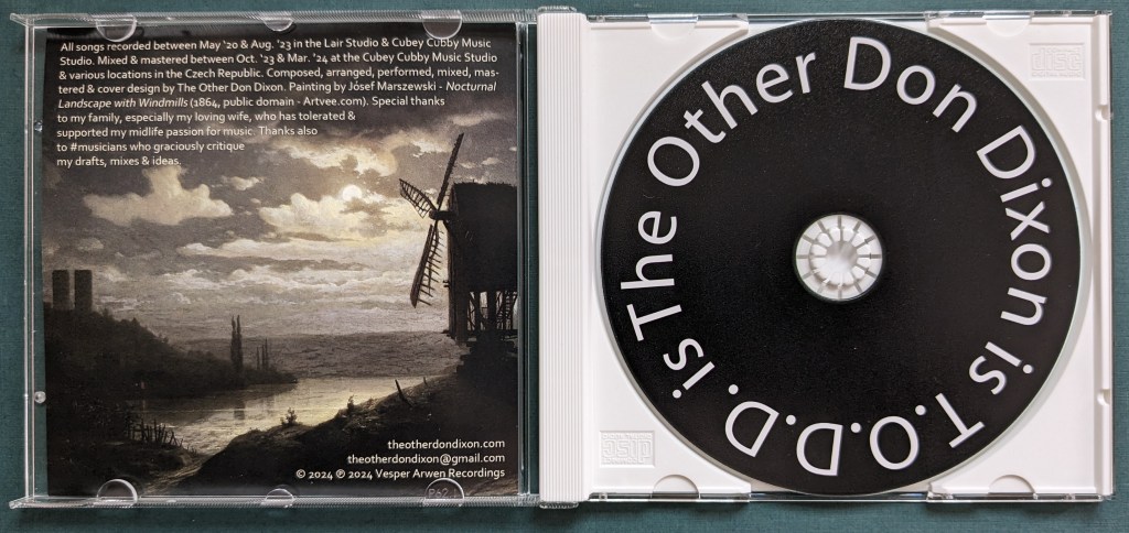 Over the holidays, I reviewed my new work to date and for T.O.D.D., I need about 20 to 25 minutes of good material before I am ready to start mastering a new album. For The Other Don Dixon, I am closer, maybe 15 minutes of material is needed. That doesn’t necessarily mean that a new The Other Don Dixon album will come before a T.O.D.D. album, it really just depends on how my muse strikes. Like today, the muse is not there, so instead, I am studying up on compression and EQing. If I were to be pressed into guessing when a new album will be released, I would estimate summer. Perhaps I will make my birthday a target release date, which I have done before.