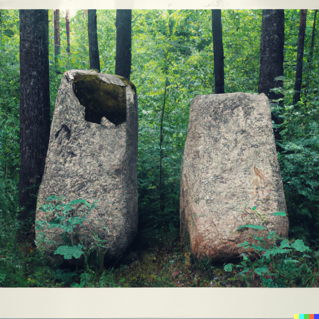 An image from DALL-E using the description “two giant identical rectangular stone monoliths in the forest in the style of a polaroid photograph” So after ditching AI, I sought out some public domain art on the site Artvee.com. If you are not aware of this site, it is great for finding public domain artwork. I was seeking out something with two people looking off in the distance, but the image I found in the end offered me so much more.
