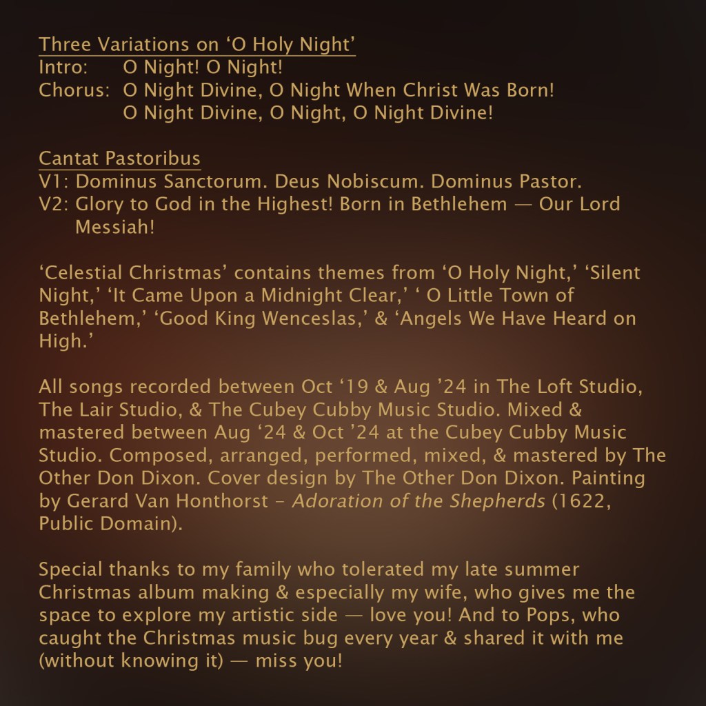 Every one in a while, I do get into the holiday mood and dabble with some holiday music. My first was “What Child Is This?” also known as “Greensleeves.” I actually released this one as a single back in 2020, back when I knew far less than I do now about audio production, mixing and mastering, so I pulled the single, cleaned it up and put it in this release.