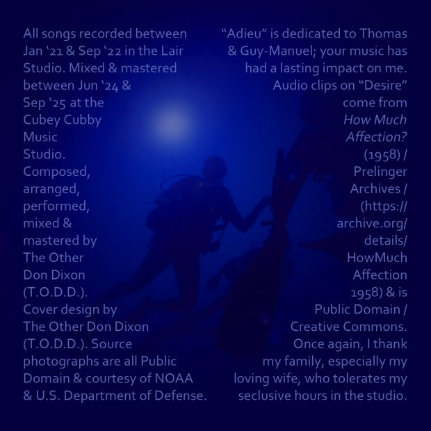 The final track on the EP is something I composed after I learned that Daft Punk was breaking up. Daft Punk is one of my favorite bands and I especially loved their work on Tron Legacy. So I started the piece with a brass fanfare, in their honor ,and then I moved into something that sounds kind of like Daft Punk, but also sounds like me. It is electronic, but also has strings. At one point, I joked with myself that it is by T.O.D.D and features The Other Don Dixon. Hopefully get the humor in that. In the end, I called it, appropriately, “Adieu.”